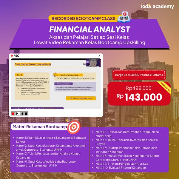 Bootcamp Financial Analyst adalah program pembelajaran berbasis video rekaman yang dirancang untuk membekali kamu dengan keterampilan analisis keuangan yang mendalam dan aplikatif. Dalam kelas ini, kamu akan mempelajari teknik analisis laporan keuangan, pengelolaan modal kerja, penilaian investasi, serta strategi pendanaan untuk berbagai jenis bisnis, mulai dari corporate, startup, hingga UMKM. Dengan pendekatan berbasis studi kasus, kamu akan memahami bagaimana menerapkan strategi keuangan yang tepat untuk meningkatkan profitabilitas dan kestabilan bisnis.