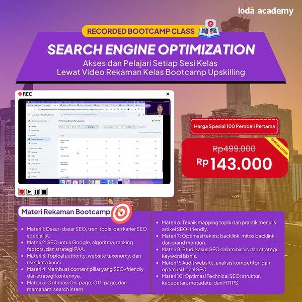 Bootcamp Search Engine Optimization (SEO) adalah program pembelajaran berbasis video rekaman yang akan membekali kamu dengan strategi dan teknik SEO terbaru untuk meningkatkan peringkat website di mesin pencari. Dalam kelas ini, kamu akan belajar dari dasar hingga tingkat lanjutan, mulai dari riset kata kunci, optimasi on-page & off-page, hingga technical SEO. Dengan materi yang disusun secara sistematis, kamu akan memahami bagaimana algoritma Google bekerja, strategi content marketing berbasis SEO, serta cara melakukan audit website secara profesional.