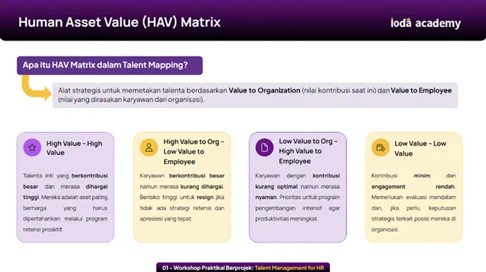 Dalam project ini, kamu akan berperan sebagai HR Development yang diminta merancang strategi Talent Retention dan Succession Planning untuk posisi-posisi kritikal di perusahaan. Tantangan utama dalam project ini adalah mengintegrasikan data talent mapping, hasil penilaian performa, serta kebutuhan bisnis jangka panjang. Kamu perlu mengidentifikasi peran kritikal, menentukan kandidat suksesor, merancang program retensi untuk high performer & high potential, serta menyusun rencana suksesi yang realistis dan dapat diimplementasikan oleh perusahaan. Output project ini mencakup strategi retensi, pemetaan suksesor, rencana pengembangan suksesi, dan indikator keberhasilan. Dokumen ini menjadi fondasi perusahaan dalam menjaga keberlanjutan talenta kunci dan mengurangi risiko turnover pada posisi strategis.Hard
